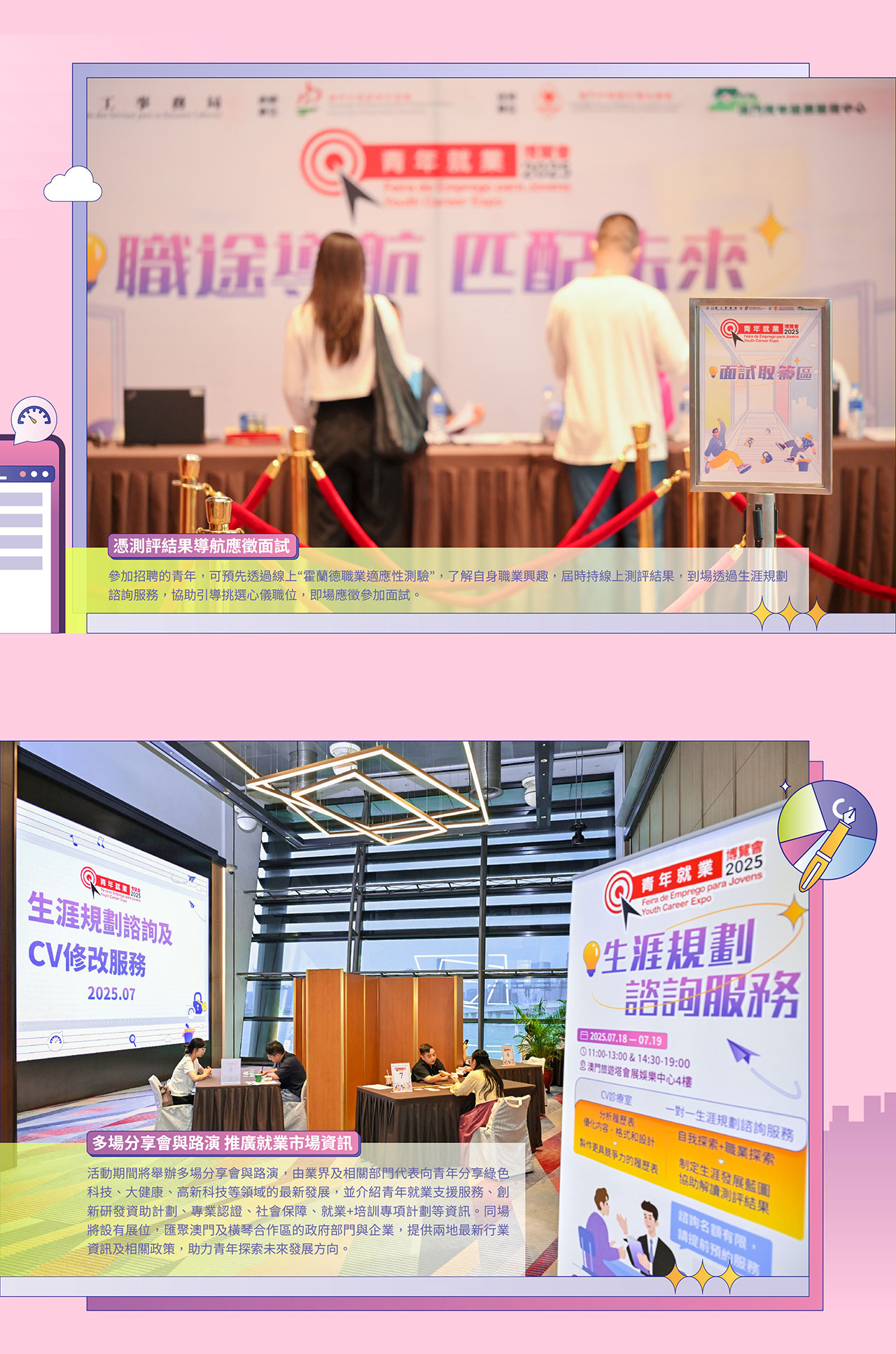 其中✴️即場面試逾 950 人✴️路演&分享會&展位逾 900 人✴️生涯規劃諮詢逾 170 人✴️霍蘭德職業測評由推出起計逾 1,300 人次使用充分展現澳門青年對職業發展的熱切關注❤️🔥